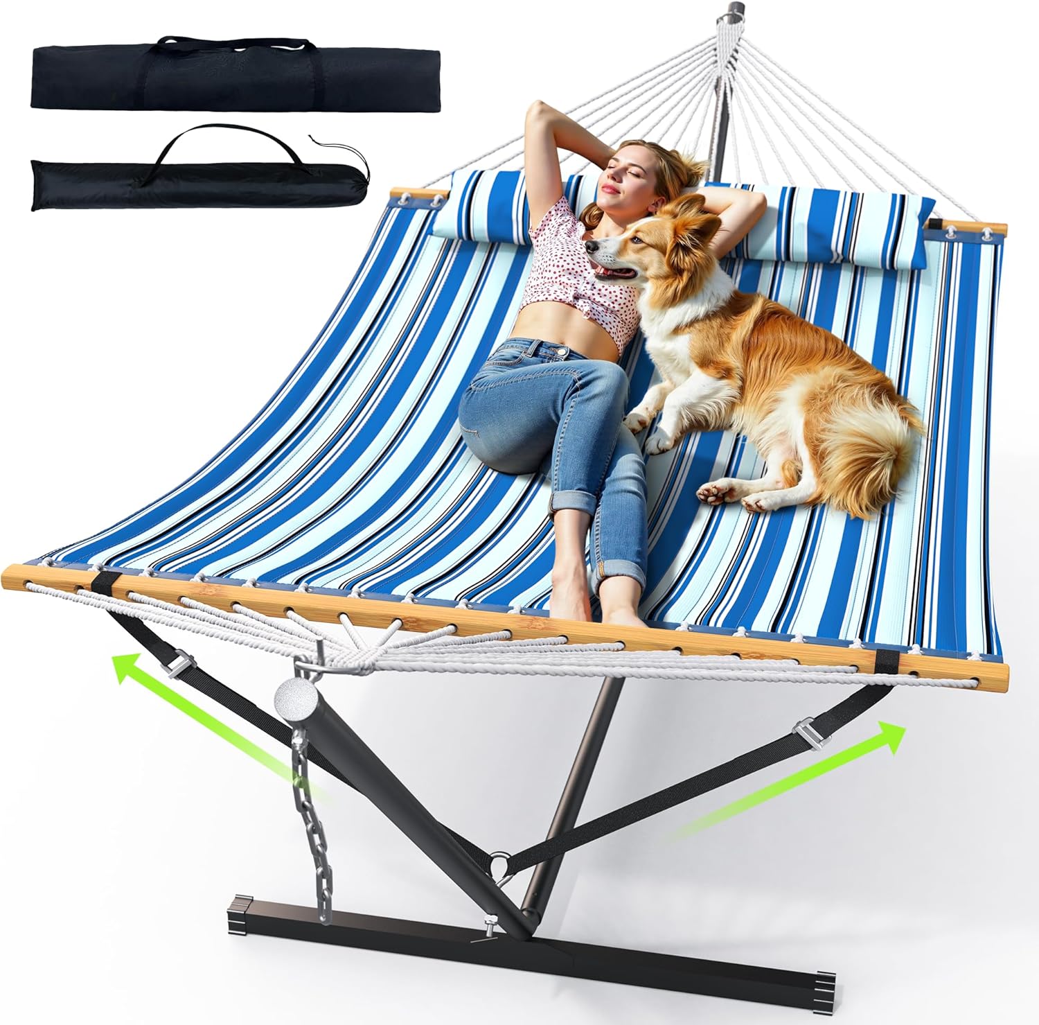Double Hammock with Stand for Outdoor, Heavy Duty Portable Hammock with Adjustable Steel Stand for Patio, Garden, Beach, Backyard - Includes Carrying Bag,White Grey