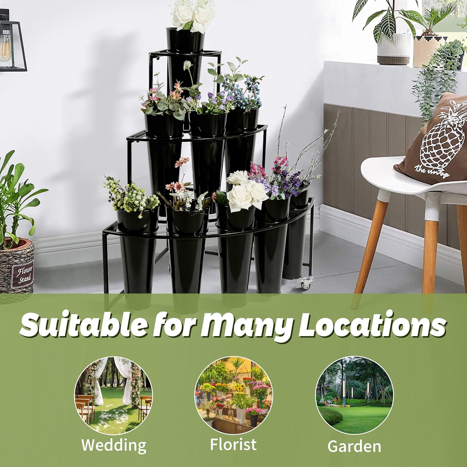 Flower Display Stand, 3 Layers Flower Cart Shelf with 9 Buckets, Flower Bar with 360° Swivel Wheels and Brake, Arch Flower Buckets Rack for Indoor, Florists, Garden, Flower Pop-Up Events