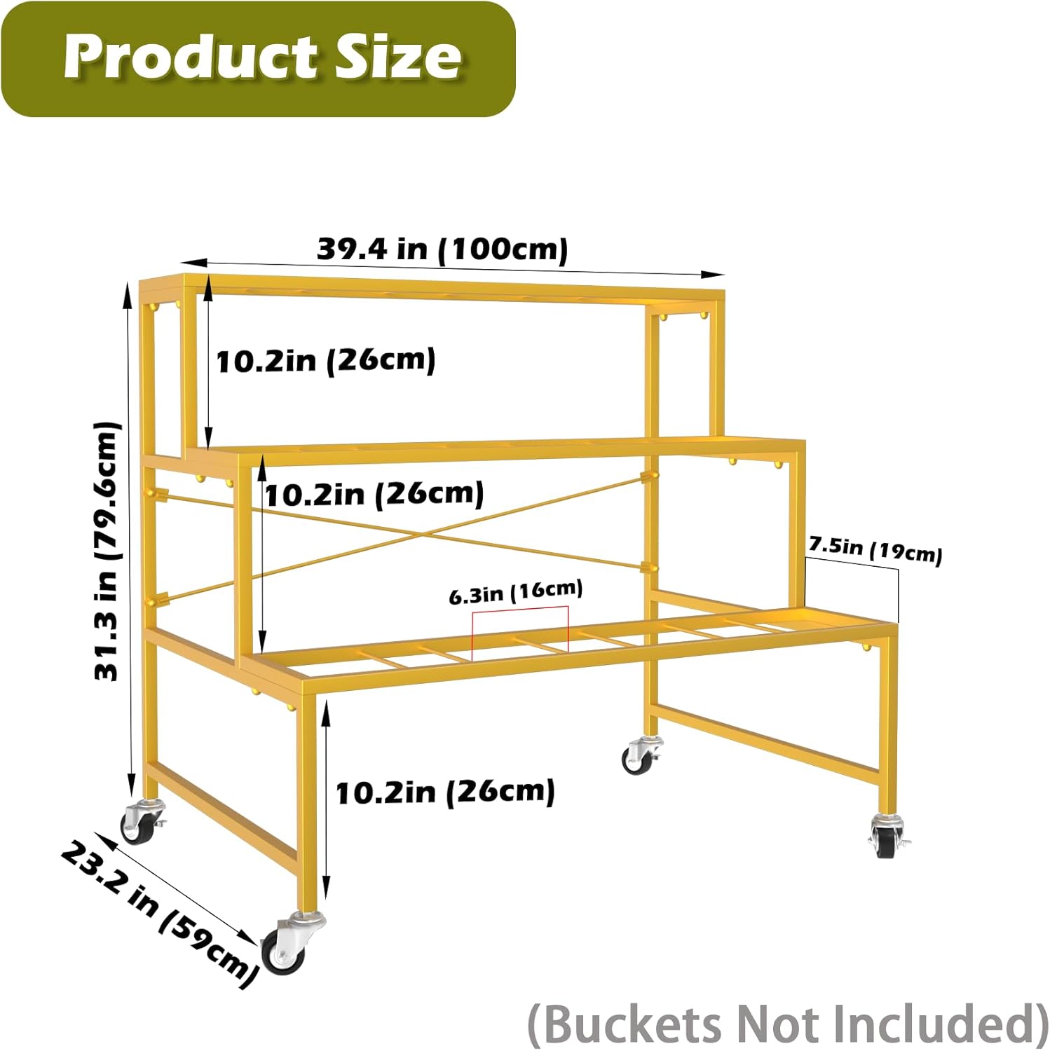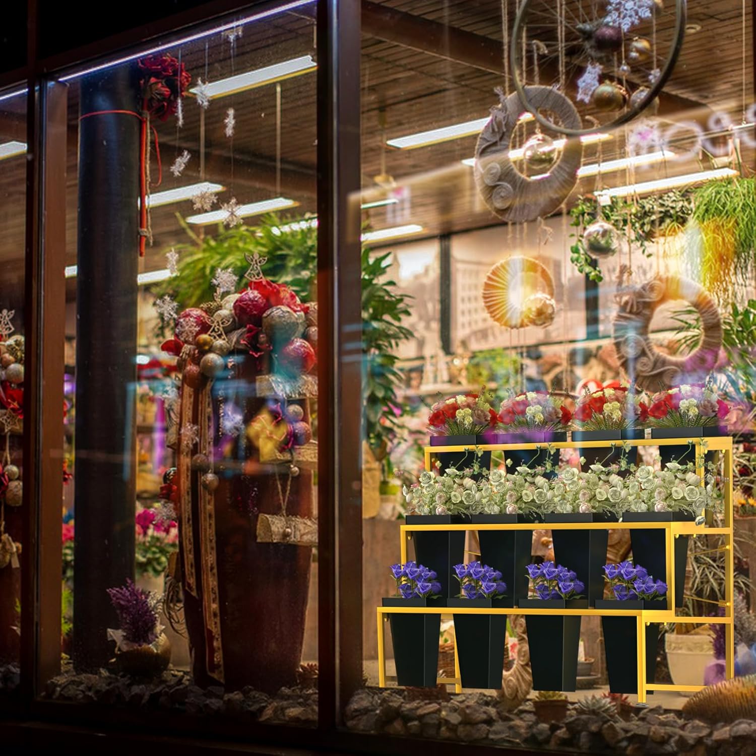 Flower Display Stand, 3 Tier Metal Plant Stand with 12pcs Plastic Flower Buckets, Moving Heavy Duty Flower Cart Flower Rack Indoor,Outdoor Patio,Garden,Living Room,Florist(with 12 black Buckets)