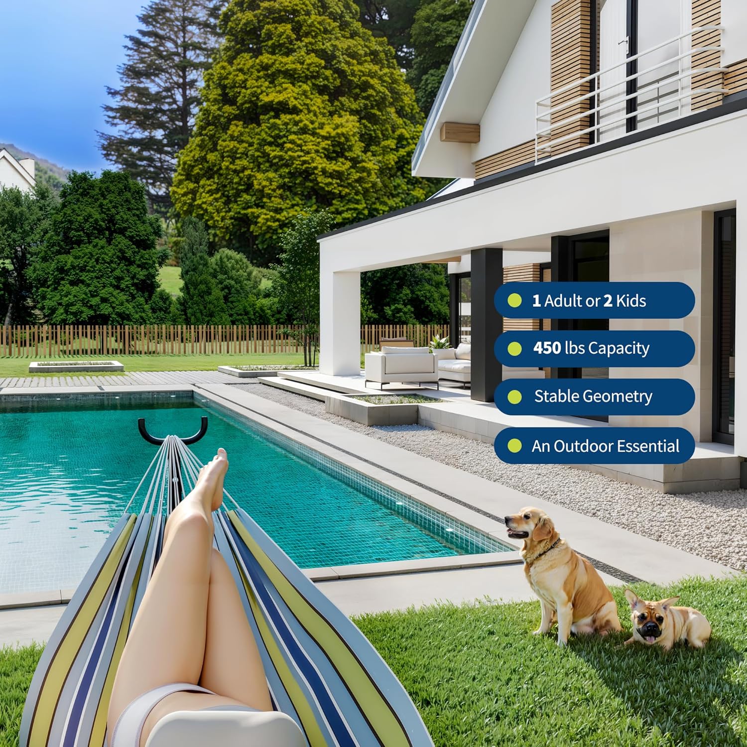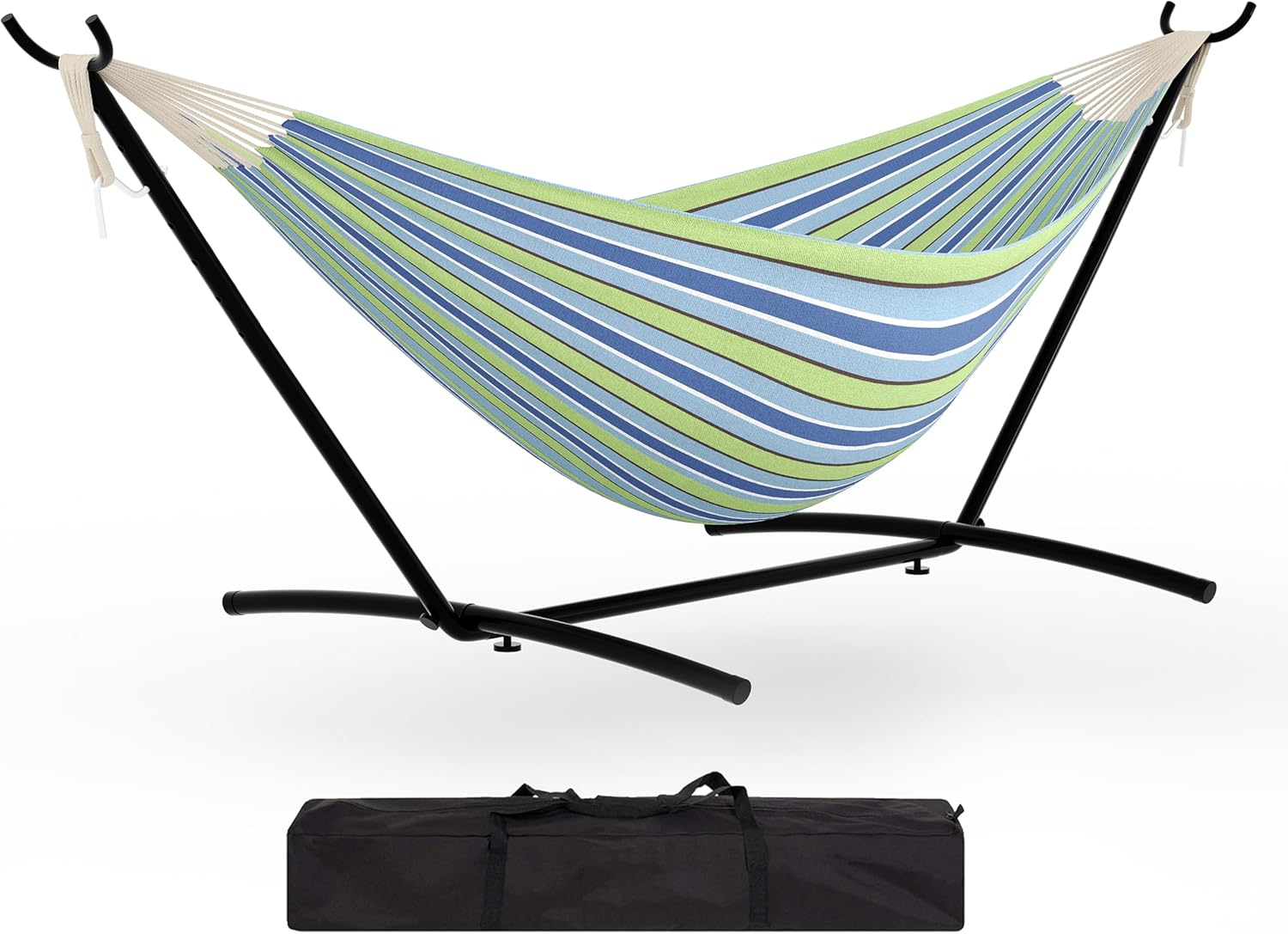 Instant-Setup 2-Person Hammock with Reinforced Steel Frame – Portable Outdoor Lounger for Garden, Camping & Beach (450lb Capacity + Quick-Fold Carry Bag),Blue-Green Stripes