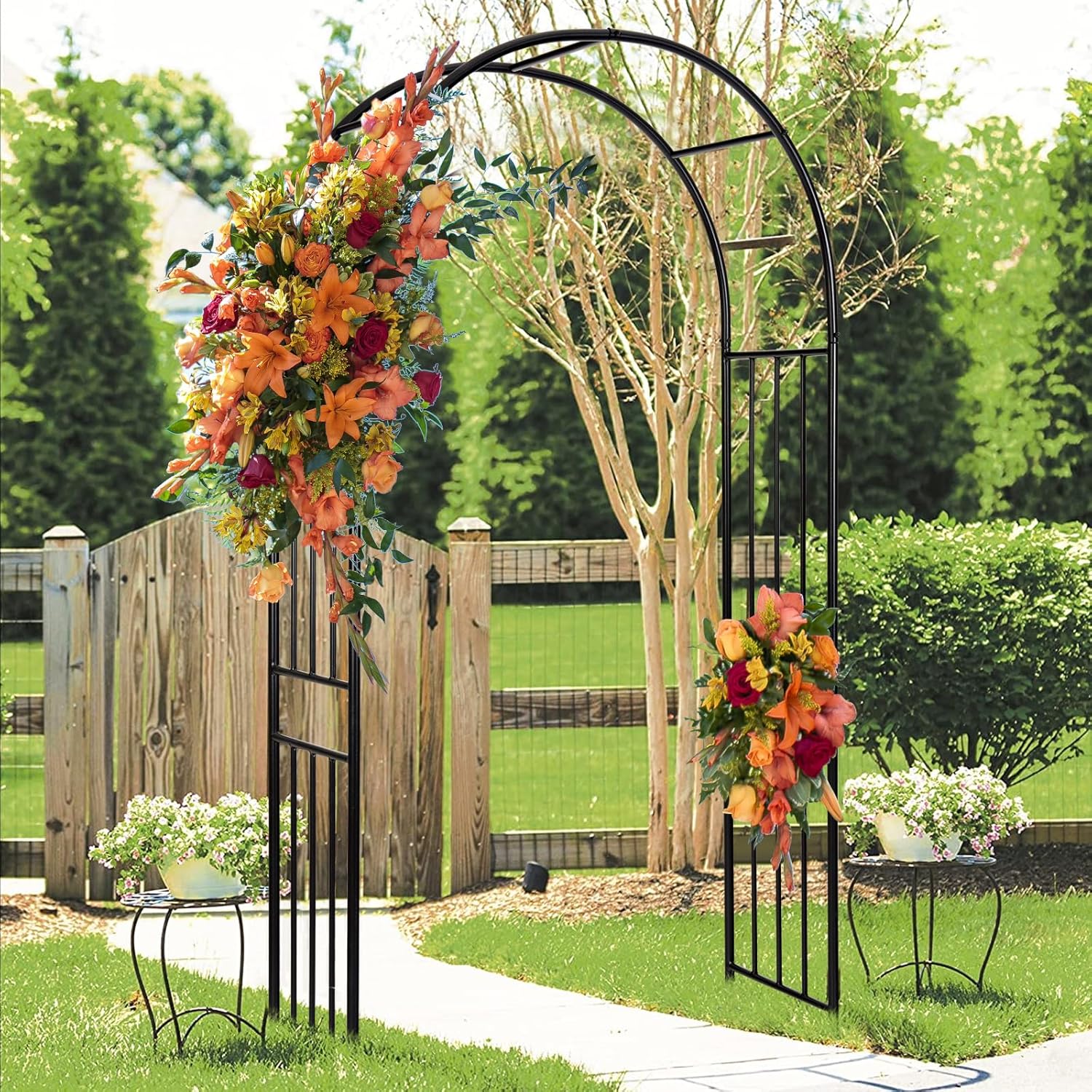 LDAILY Moccha Garden Arch Arbor Trellis, 7.2Ft Outdoor Steel Arbor with Stakes, Metal Archway for Climbing Plants, Wide Sturdy Garden Arch for Lawn, Party, Ceremony Wedding Decoration, Black